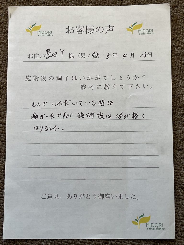 お客様の声体が軽くなり 喜びの声をいただきました もんでいただいている時は痛かったですが、施術後は体が軽くなりました。 他のお客様の声 不調改善の喜びの声をいただきました背中の違和感改善の喜びの声をいただきました体が軽くなり 喜びの声をいただきました身体の歪みを整え 喜びの声をいただきました腰痛・肩こり改善の喜びの声をいただきました頭痛改善の喜びの声をいただきました
