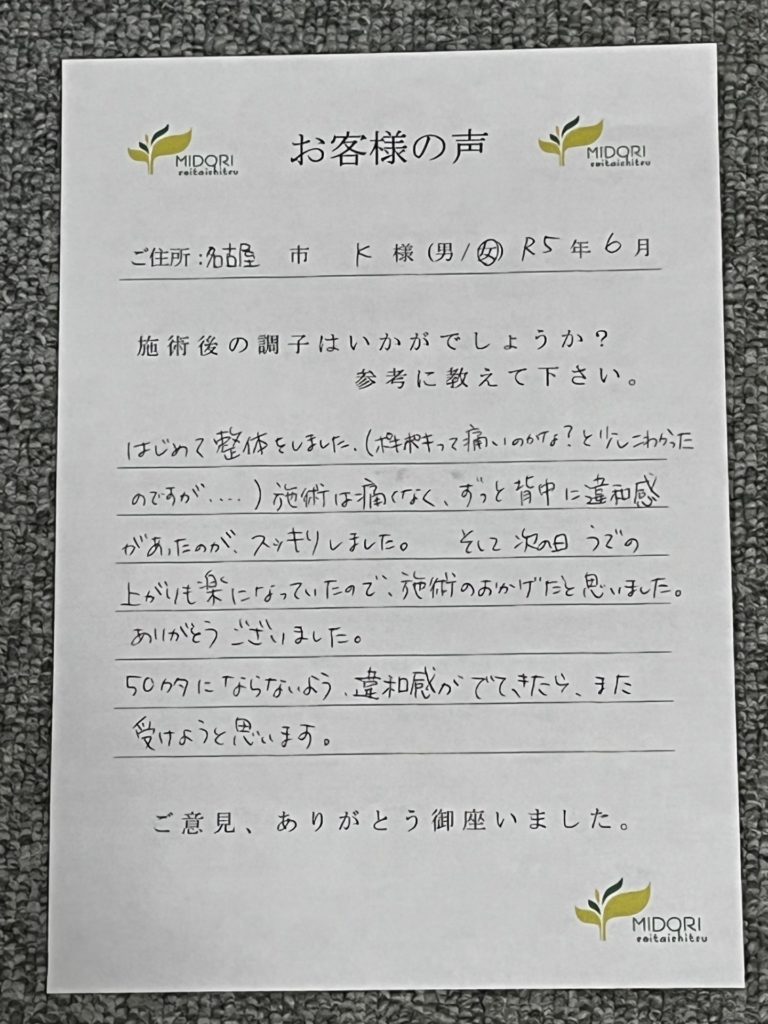 お客様の声背中の違和感改善の喜びの声をいただきました はじめて整体をしました。(ポキポキって痛いのかな?と少しこわかったのですが・・・)施術は痛くなく、ずっと背中に違和感があったのがスッキリしました。そして次の日 腕の上がりも楽になっていたので、施術のおかげだと思いました。ありがとうございました。五十肩にならないよう、違和感がでてきたら、また受けようと思います。 他のお客様の声 不調改善の喜びの声をいただきました背中の違和感改善の喜びの声をいただきました体が軽くなり 喜びの声をいただきました身体の歪みを整え 喜びの声をいただきました腰痛・肩こり改善の喜びの声をいただきました頭痛改善の喜びの声をいただきました